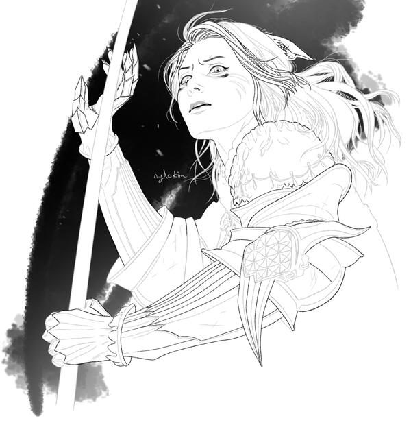 After weeks traveling and stumbling through the city-states with her poor Common, she settled in New Gridania. There she was welcomed and aided by the city's educators to improve her language skills, including finally learning reading and writing. When she reached an adaquate level of stability she enlisted in the local Lancer's Guild. Some months later began her life as an adventurer for hire.During a job two months into her new trade she encountered a strange glowing crystal. Upon touching it she was rendered unconscious and pulled into an audience with the Crystal Mother, Hydaelyn. The goddess named her a Warrior of Light and triggered her awakening to Echo, a power rarely granted to mortals. Her soul and body's makeup were reached into and drastically changed through Hydaelyn's manipulation.The process was an intense probing, as her soul was restructured piece by piece and seemed to last an eternity robbing her of control with no escape. For some time she was confined to the Carline Canopy under Mother Miounne's care and was largely unresponsive. To the present day she never speaks of it save to a select few, and even then it takes a toll.She gained a superhuman body in every respect, the Echo and its universal ability to see into the past at random, as well as its worst side effect- immortality.Within the day once she returned to consciousness members of the Scions of the Seventh Dawn took interest. In time she felt pushed into their service as no other organizations had the knowledge she needed to understand what'd happened to her.In addition to being bound into their servitude, the Scholars among them measured her body through experiments. Memories of Hydaelyn's violation flooded her each time leading to panic attacks or isolation before and after; the pain of that trauma kept her from communicating it, so she endured.Under them she became forged into being given the mantle Warrior of Light by the people. Her nigh godly prowess in combat combined with infinite resurrections should her body perish made her the perfect weapon against the land's enemies.
